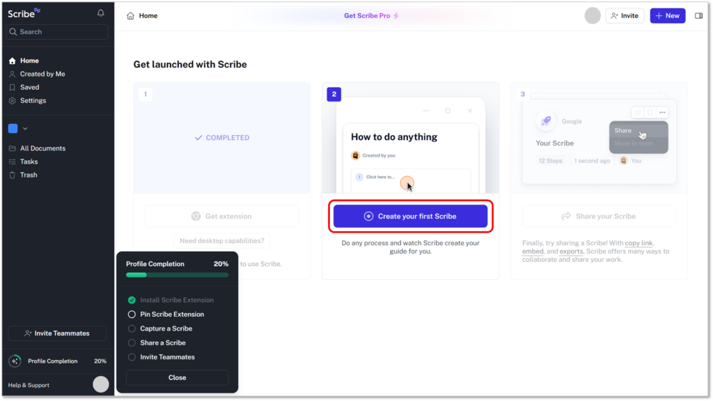 以下の画面の「Start Capture」、またはその下の画面の「Create your first Scribe」から記録を開始することができます。