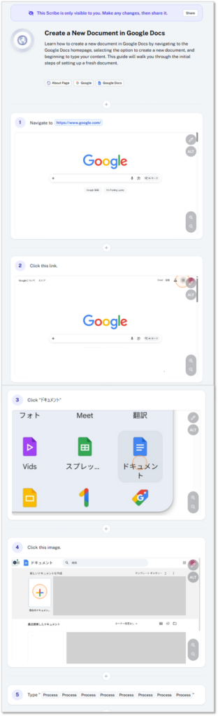 録画ボタンを押して普段の作業を画面上で再現して見せるだけで、ステップバイステップの手順書が自動で生成されます。