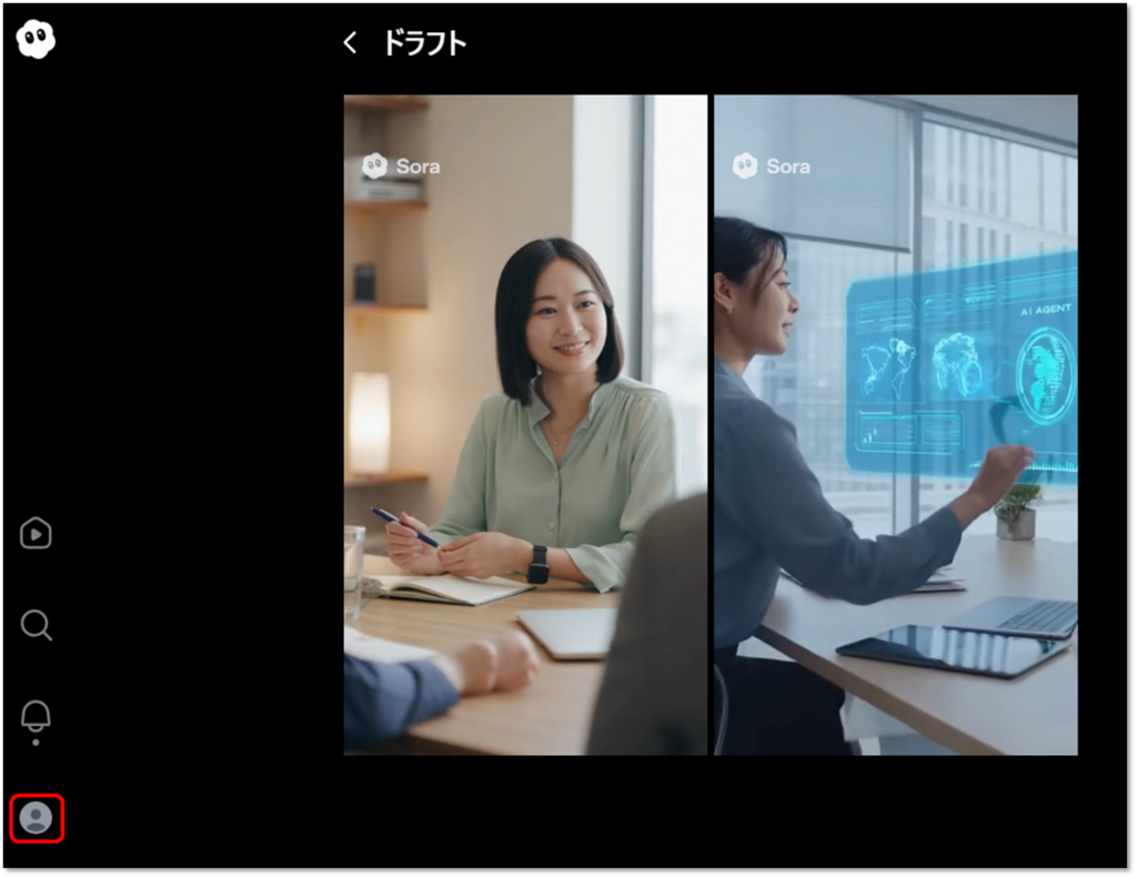 アイコンをクリックするとマイページが表示され、動画の生成が完了すると自動的にドラフト一覧にサムネイルが表示されます。