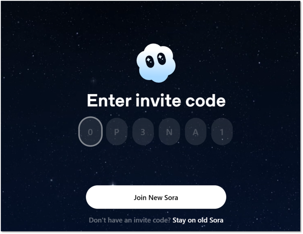 白いボタンを選択すると以下のように、Sora2の招待コードの入力画面が表示されます。