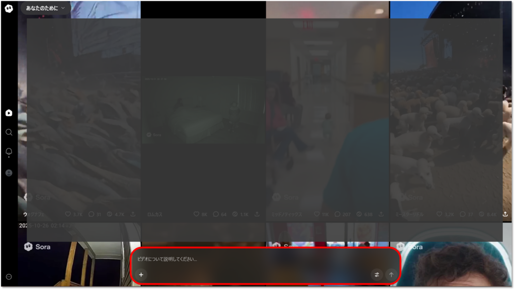 Sora2の操作は非常にシンプルで、専用の入力欄にテキストを打ち込むだけで動画生成が始まります。