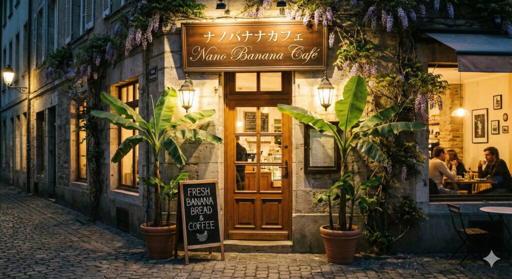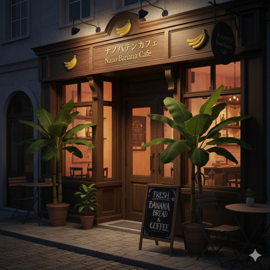木製の看板に「ナノバナナカフェ」「Nano Banana Cafe」と日本語と英語で書かれている。