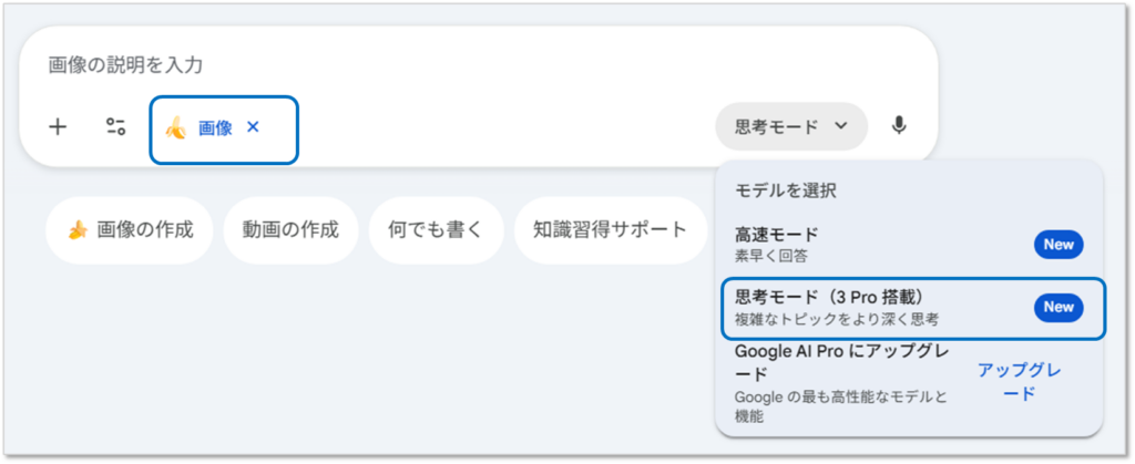「思考モード」はNano Banana Pro、「高速モード」は通常のNano Banana(標準版)で画像生成されます。