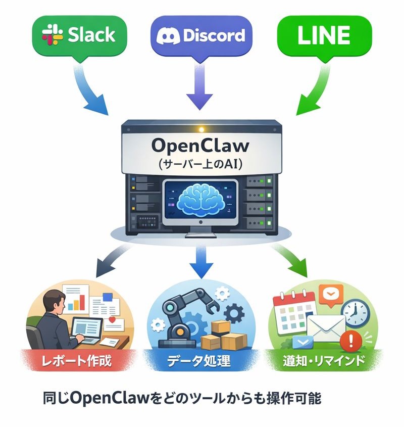 たとえば、社内サーバーにOpenClawを配置し、Slack、Discord、LINEといったツールを、操作窓口(インターフェース)として使うイメージです。